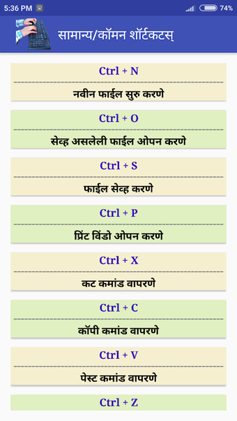 O aplicativo 'Computer Shortcut Keys' é uma ferramenta educativa projetada para ajudar os usuários a aprenderem os atalhos de teclado essenciais para diversas aplicações no computador. Disponível em inglês, marathi, hindi e gujarati, o aplicativo oferece uma interface simples e acessível, permitindo que qualquer pessoa possa se beneficiar. Ele cobre uma ampla gama de tópicos, incluindo atalhos comuns, Windows e programas populares como MS Word, Excel, PowerPoint, entre outros.